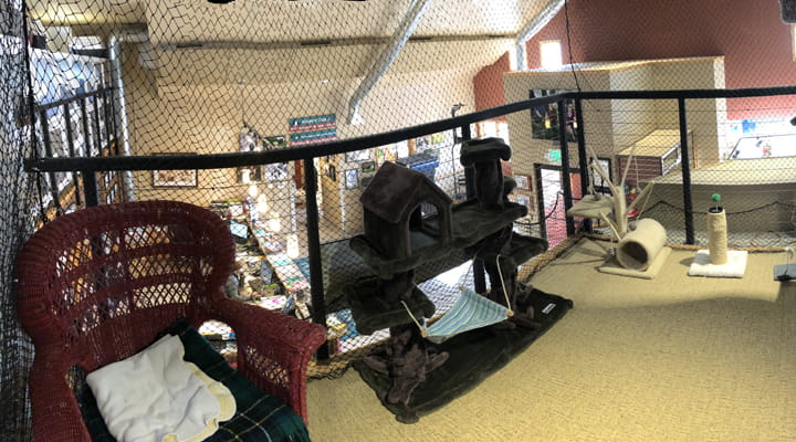 Condos - Our bright abd spacious Kitty Condos look over our lobby so they can watch the activity below or gaze through the windows. Cats can relax in their own private condos which are 2×4 open face enclosures complete with 2 rooms and perches. The units have removable pass through portals allowing us flexibility to combine condos together. Thus cats from the same family can visit each other as desired while maintaining their private space as well.