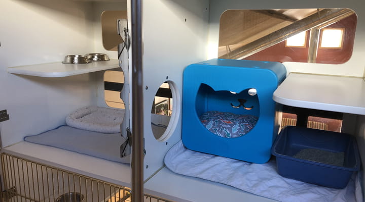 • We can reconfigure many of our kennels and kitty condos to accommodate a family of multiple pets who want to board together.