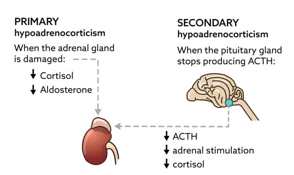 Addison's disease may also result from decreased stimulation of the glands by the pituitary hormone ACTH (called secondary hypoadrenocorticism). Secondary Addison's disease is rare, and may be related to trauma, inflammation, or tumors near the pituitary gland. Decreased cortisol production is the main feature of this form of Addison's disease, while the production of aldosterone is less affected. Secondary Addison’s disease is also known as atypical Addison’s disease.