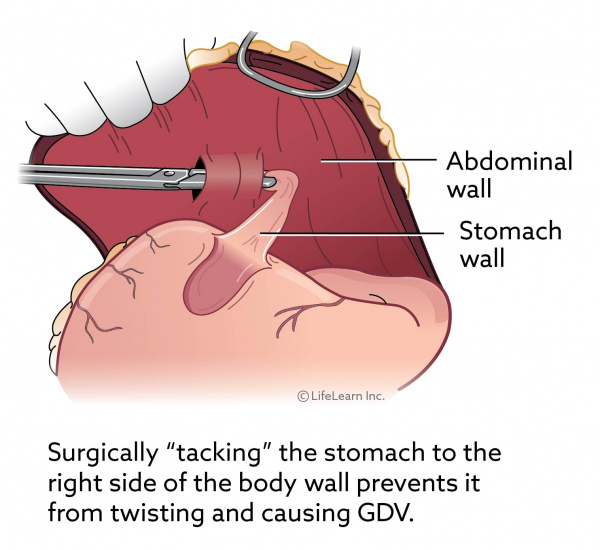 Shock must be treated immediately, using intravenous fluids and emergency medications. Once the patient becomes stable, the GDV must be surgically corrected. It may be necessary to delay this major abdominal surgery until the patient is able to undergo anesthesia.