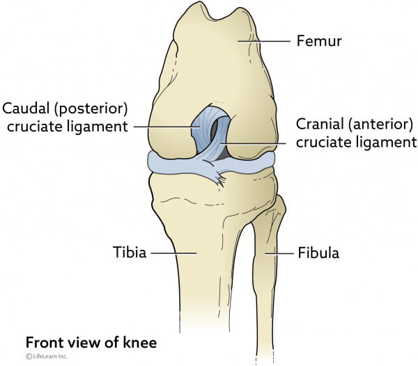 Humans have a similar anatomical structure to the dog's knee, but the ligaments are called the anterior and posterior cruciate ligaments. Anterior cruciate ligament (ACL) rupture is a common knee injury in athletes.