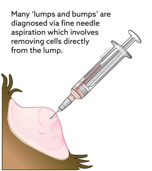 There are several different methods for collecting cells from tissues, depending on where the problem is and what type of tissue is involved. The most common technique is called fine needle aspiration (FNA). This simple technique involves using a sterile, fine gauge needle attached to an empty syringe. The needle is inserted into the middle of the tissue in question and the plunger of the syringe pulled back to create suction, withdrawing (or aspirating) cells. Sometimes you may see your veterinarian poke the lump multiple times. Cells can be aspirated from solid tissues, such as organs or tumors, and fluid-filled tissues, such as joints or cysts (see handout “Fine Needle Aspiration”).