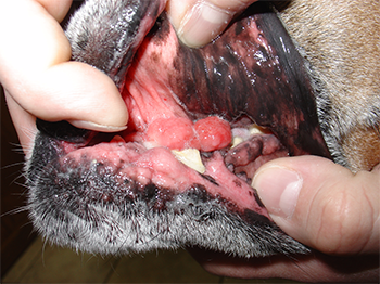 Less commonly, gingival hyperplasia may be triggered by the use of certain drugs. The drug most frequently associated with gingival hyperplasia in veterinary patients is cyclosporine (Atopica®). Cyclosporine is an immunosuppressive drug that is used to manage allergic and autoimmune diseases. Gingival hyperplasia may also be associated with the use of calcium channel blockers (used to treat cardiovascular disease) and phenytoin derivatives (used to control seizures), though these medications are used far less frequently than cyclosporine in veterinary patients.