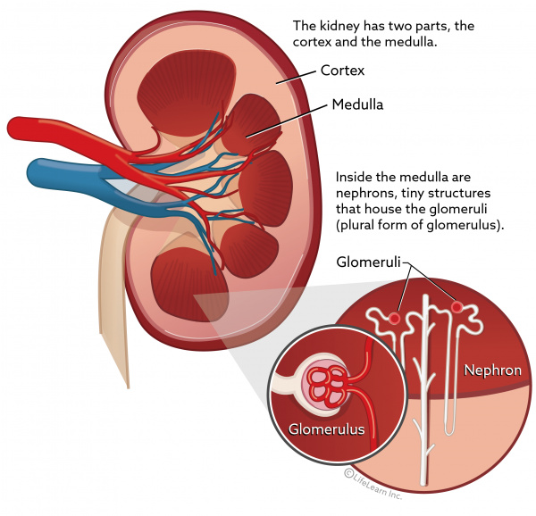 Glomeruli are microscopic structures in the kidney that filter toxins (waste products of normal bodily functions) out of the blood. The role of the glomeruli is to remove all the small metabolic toxins from the bloodstream and leave the larger molecules (specifically blood proteins) in the blood where they belong. The filtration of these waste materials is the first step in the formation of urine. There are millions of glomeruli within the kidneys. When these structures are damaged, kidney function is greatly impaired and toxins build up in the body, causing serious illness.
