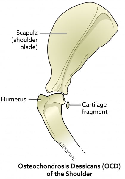 The term osteochondrosis refers to an abnormal development of the cartilage on the end of a bone in the joint. Osteochondritis dissecans (OCD or OD) is an inflammatory condition that occurs when the diseased cartilage separates from the underlying bone. It most commonly affects the shoulder joint but the elbow, hip, knee (stifle), or hock (tarsus) may also be affected.