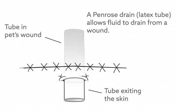 Drains should be removed as soon as possible, usually within two to four days. Drains may need to stay in place longer for more extensive wounds. A drastic decrease in the amount of draining fluid signifies that the drain is ready to be removed. Your veterinarian will provide specific instructions about how long the drain needs to remain in place.