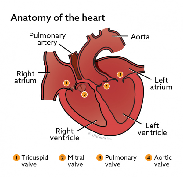 The heart also has several valves. The tricuspid valve is located between the right atrium and the right ventricle, and the mitral valve is located between the left atrium and the left ventricle.