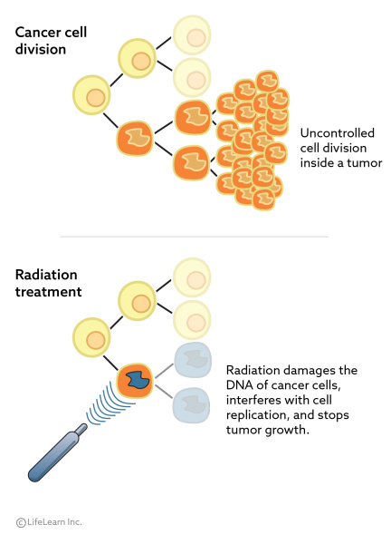 Cancer cells grow and divide faster than most normal cells. Radiation therapy works by damaging the cells’ DNA to interfere with cell replication and kill them. In this way, radiation can either shrink a tumor or destroy it.